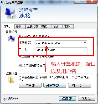 3、輸入計(jì)算機(jī)(包括IP+冒號(hào)+端口)和用戶名 并點(diǎn)擊 “連接” 如圖