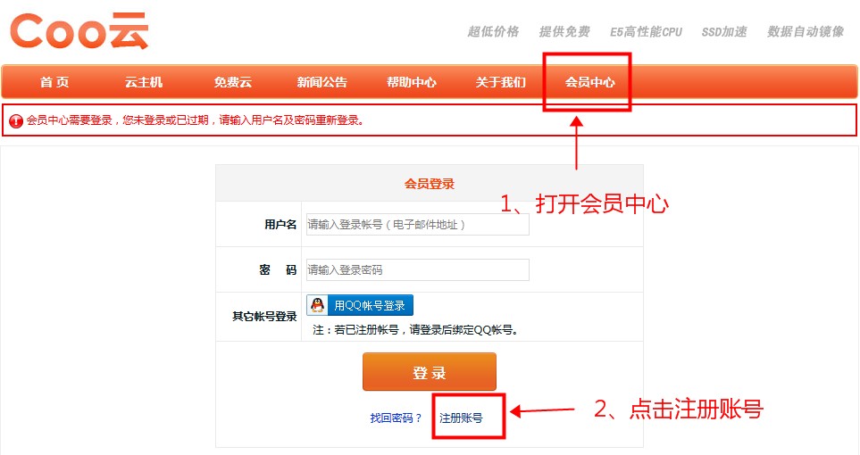 1、打開會員中心,點擊 注冊賬號。如圖: