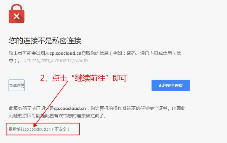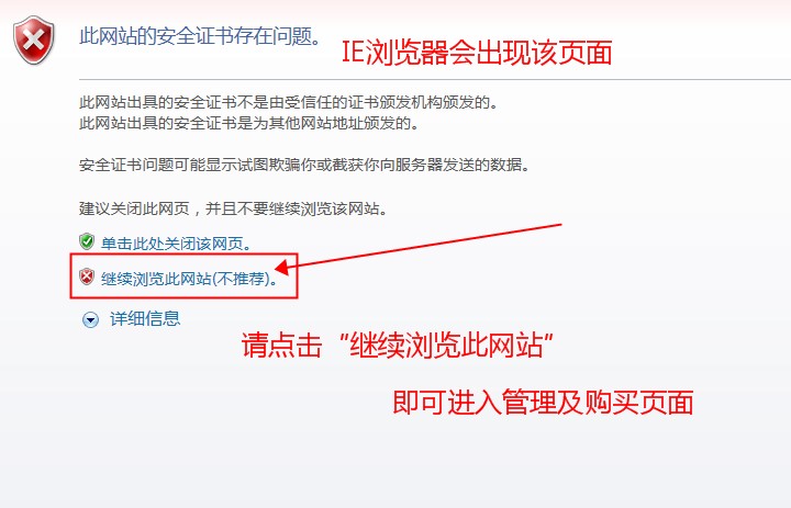 管理、購買頁面使用https協議,由于該協議的特殊性,所以訪問時瀏覽器會提示“該網站證書存在安全問題”。