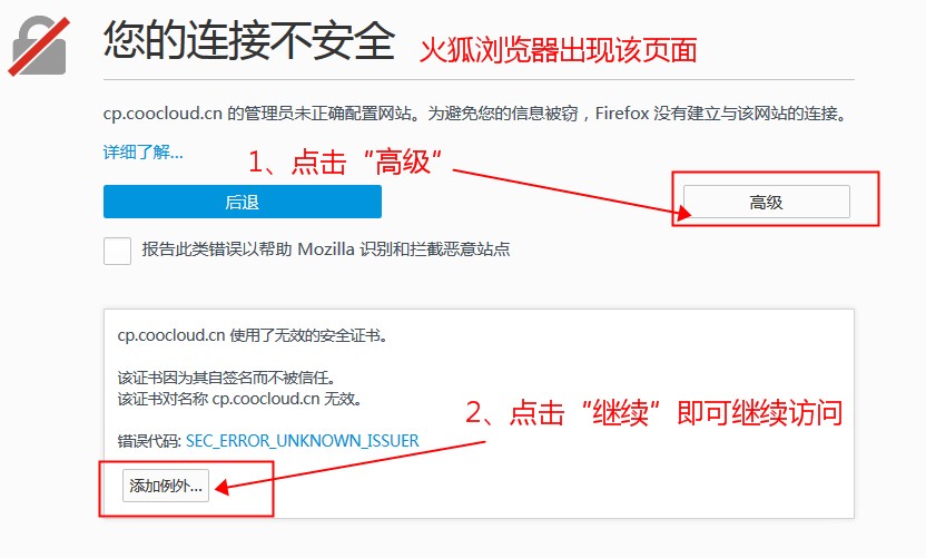2、火狐瀏覽器(點擊“高級”“添加例外”,如下圖所示):