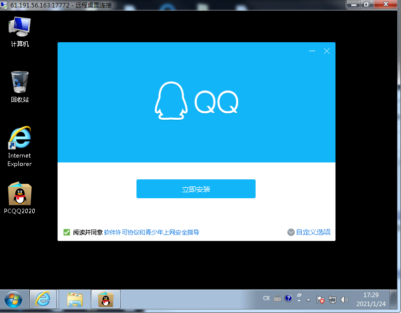 當我們連接進入vps掛機寶,就是一個Windows系統的界面了,我們打開瀏覽器,輸入騰訊QQ的官網,然后進行下載到桌面,下載時間一般需要幾分鐘就行了。下載完成之后,我們到桌面雙擊打開QQ.exe的安裝包進行安裝,如果下載的文件不是.exe后綴的,我們需要把后綴更改為.exe,否則可能安裝不了。我們按照提示正常按照就行了,一般我們建議把軟件安裝到掛機寶系統的D盤,盡量不要安裝到系統盤。
